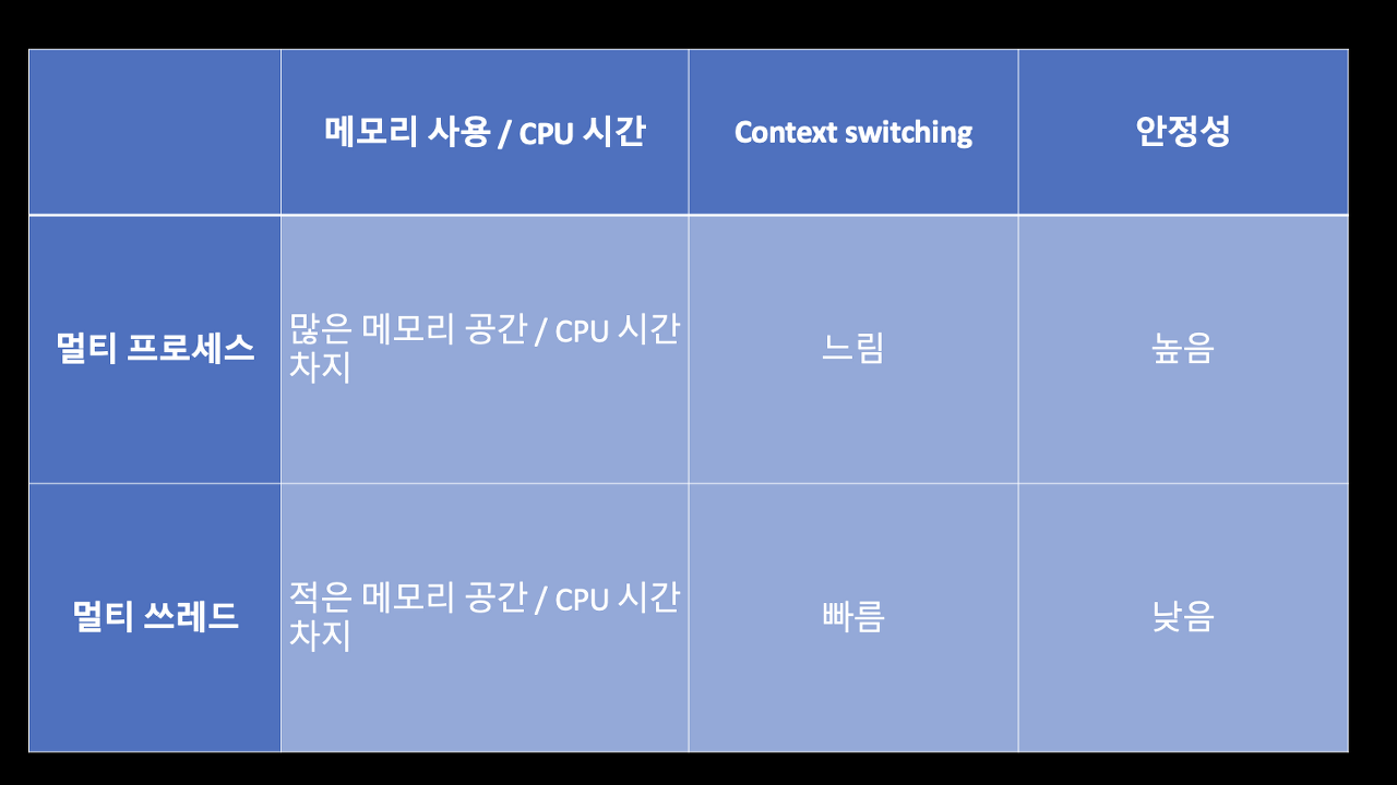 | 안정성 | 하나의 프로세스는 다른 프로세스에 영향을 주지 않기 때문에 안정성 면에서 더 좋을 수 있음 |