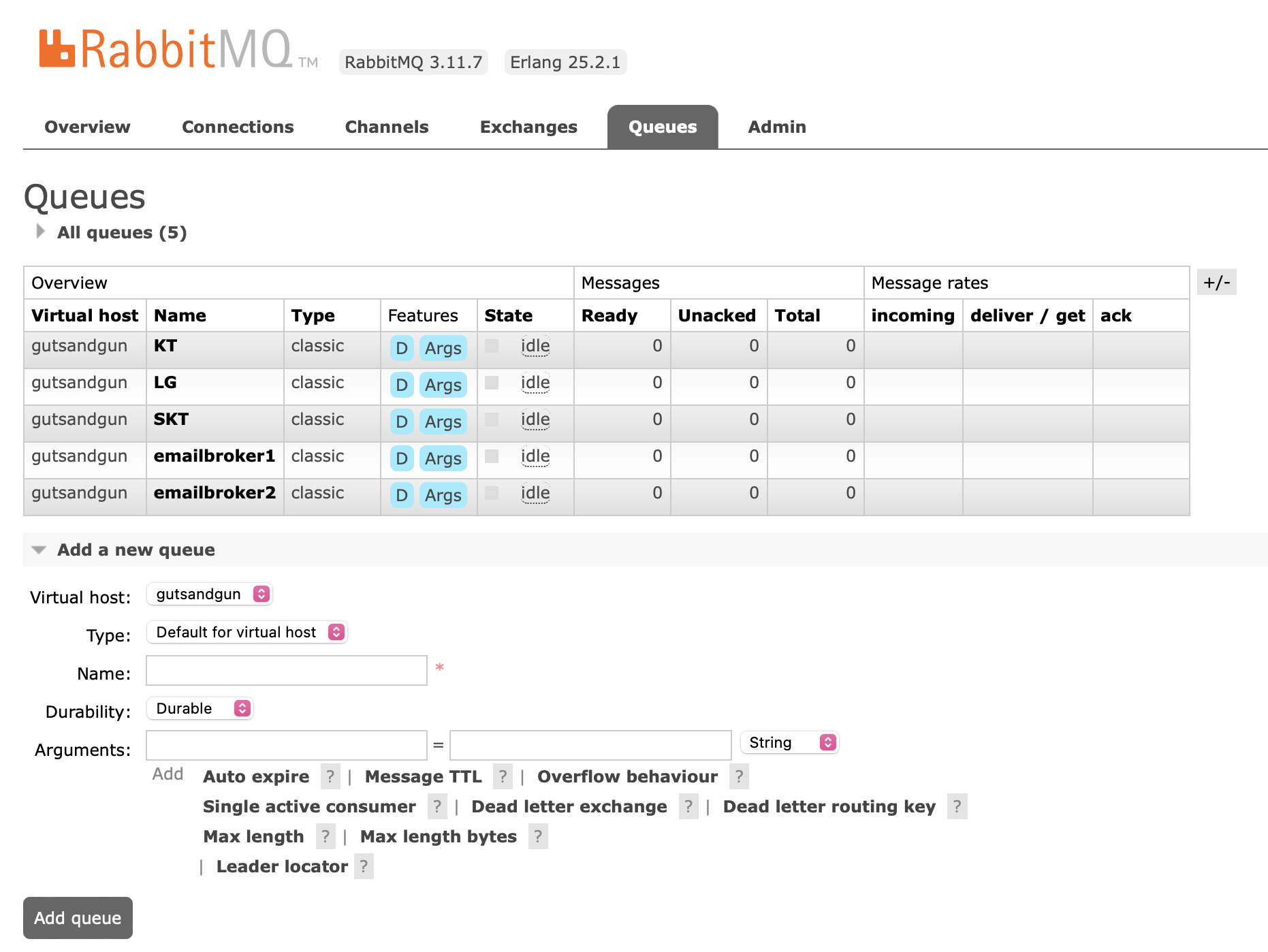 queue : SKT, KT, LG,emailbroker1, emailbroker2라는 이름의 총 5개의 큐 생성